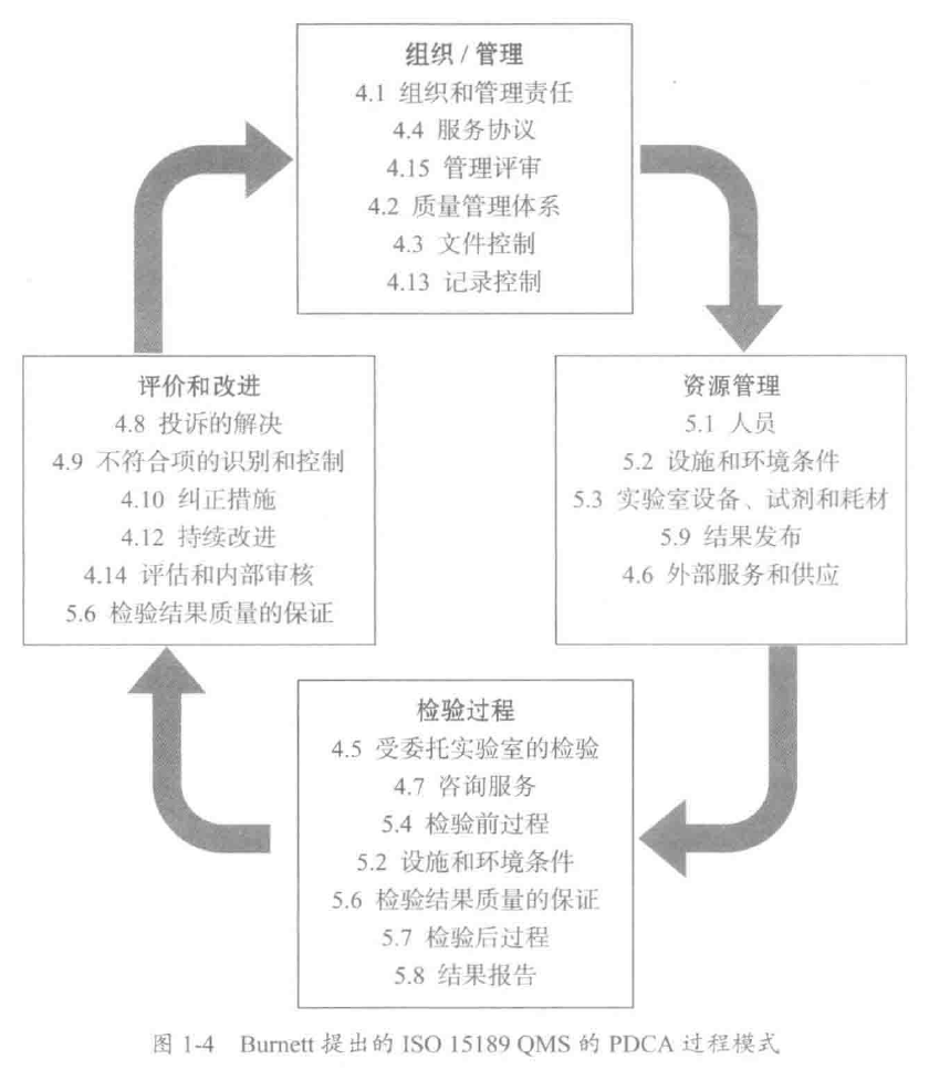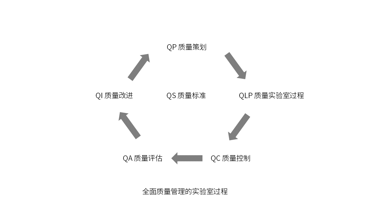 QP 指质量策划;QLP 指质量实验室过程;QC 指质量控制;QA 指质量评估;QI 指质量改进;QS 指质量标准,代表需要实现的质量方针、目的、目标和要求。需要再次指出的是,此处的 QA 指的是质量评估,而不是质量保证。质量评估是对“特点和特性的总和”进行度量和监控,质量控制侧重监控检测结果的分析质量。 在 CLIA 法规中,QA 常指质量评估,而不是质量保证。质量保证是整个质量管理体系的结果。