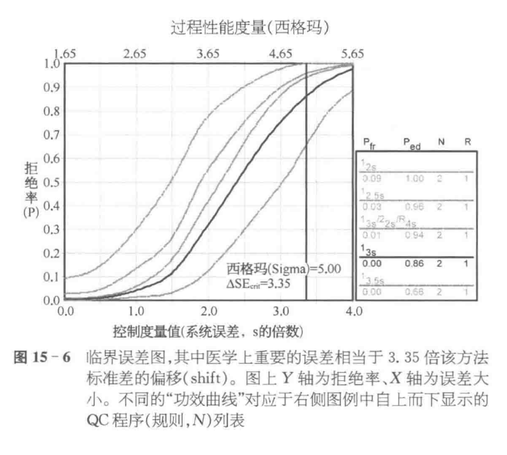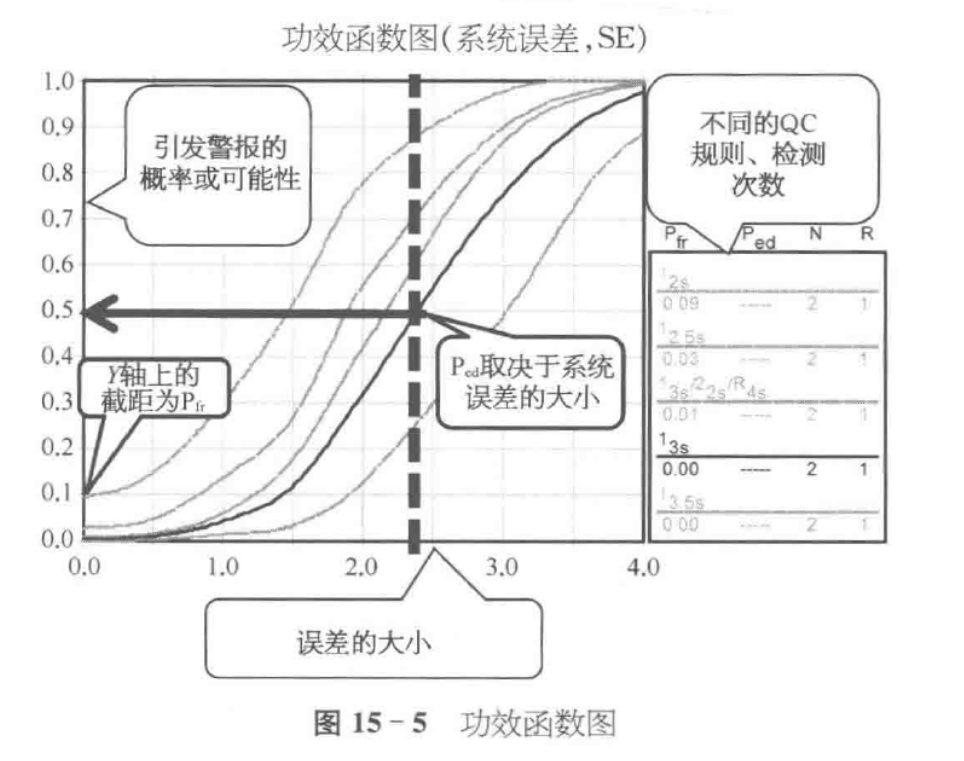 功效函数图可提供更多关于 QC 程序拒绝特性的量化信息,反映了作为误差检出系统功用之一的拒绝概率。为阐述系统误差和随机误差的检出,需要分别提供对应的功效函数图。