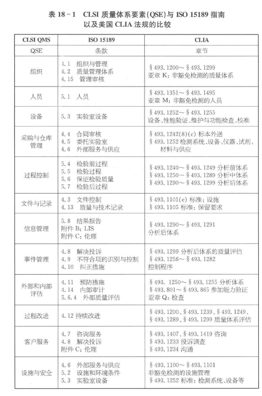 CLSI 质量体系要素(QSE)与 IS015189 指南以及美国 CLIA 法规的比较